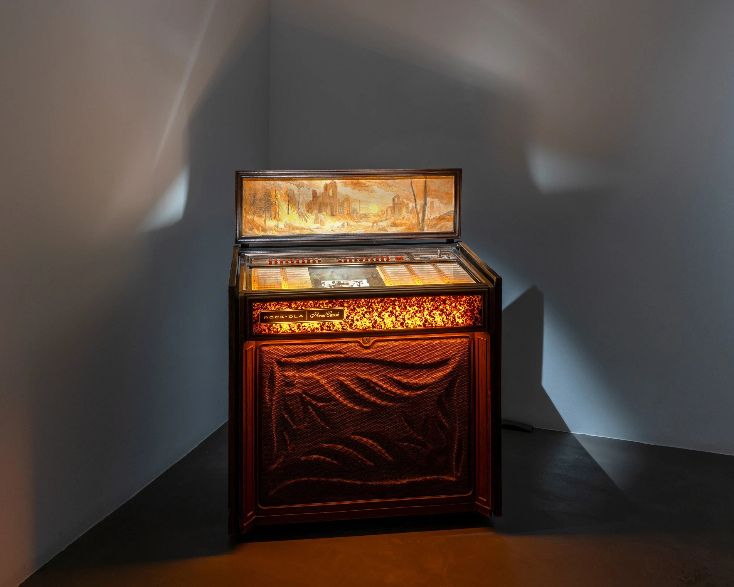This jukebox holds fifty vinyls, each circling around a single theme: the illusion of the end. Apocalypse, collapse, human despair—echoes of our darkest fears pressed into plastic. Yet, instead of silence or mourning, the machine invites us to dance. To move with disillusion, to let the rhythms of destruction become strangely celebratory, as if joy could be found in the ruins. The jukebox also bears the image of a burning, desolate landscape, a vision of ruin etched onto its body. It reminds us that the music it contains is not innocent. Each track carries within it both memory and prophecy, fusing nostalgia with catastrophe. This work is less an object than an atmosphere: a place where ruin becomes rhythm, where despair wears a mask of festivity, where the end of the world keeps spinning at 45 revolutions per minute.